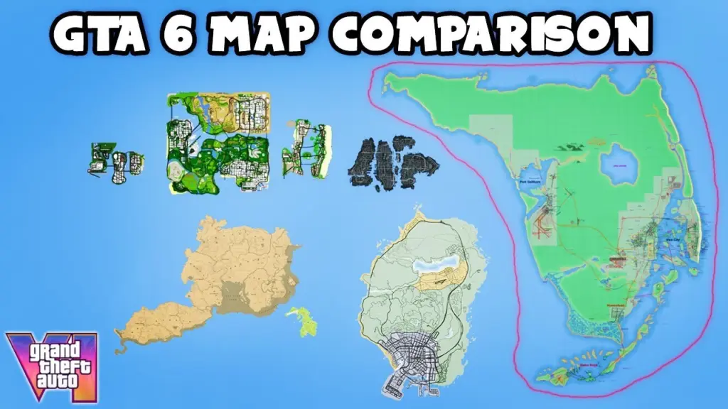 Data yang dihimpun oleh “GTA VI Mapping Project” sebuah kelompok komunitas yang merekonstruksi peta berdasarkan bocoran pengembangan dan trailer resmi, menunjukkan peningkatan skala yang masif.