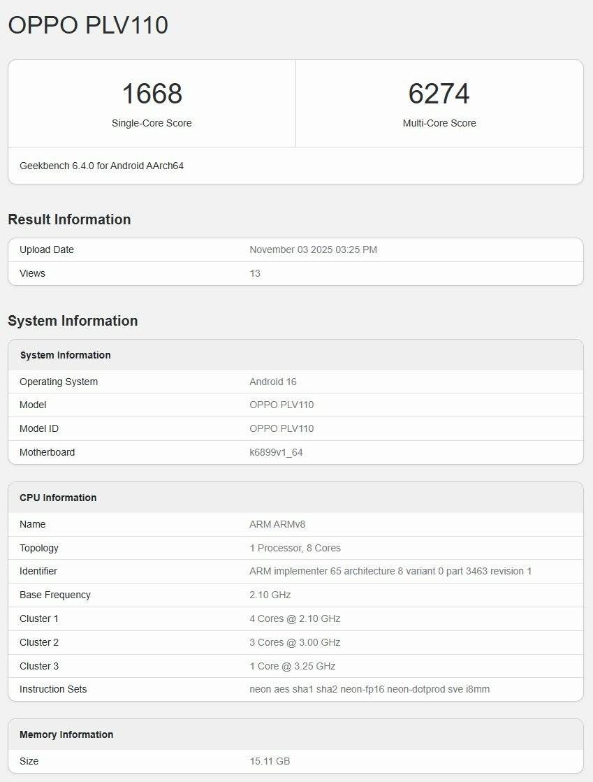Reno 15 muncul di Geekbench dengan single‑core ≈ 1.668 dan multi‑core ≈ 6.274. Ini kuat di atas kertas, tapi performa game, manajemen termal, dan optimasi UI/OS bisa berbeda.