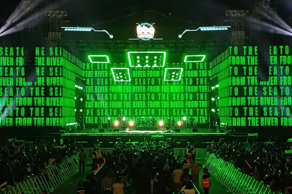 Selama lagu “Timur” berkumandang, layar LED di panggung The Adams menampilkan tulisan “from the river to the sea”. Frasa ini dikenal luas sebagai seruan pembebasan Palestina dari konflik berkepanjangan dengan Israel.